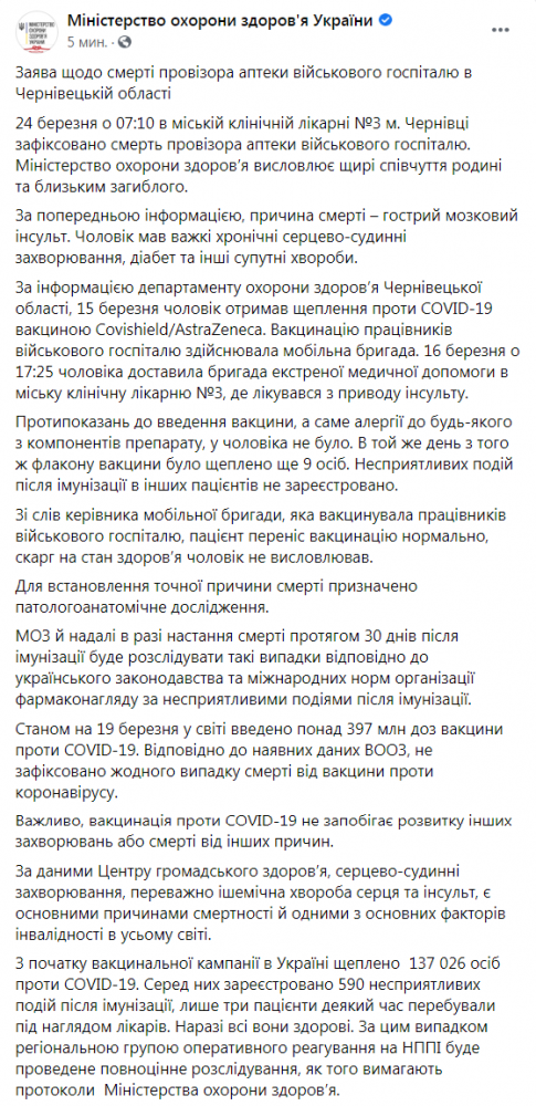 На 25 марта в Украине зафиксировано почти 600 побочных реакций на вакцинацию, три из них требовали медицинского наблюдения.