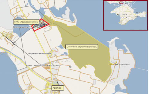 Завод «Крымский Титан» и его отстойник на карте Перекопского перешейка Крыма