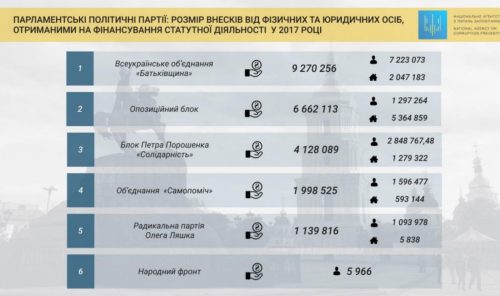 Всё началось с финансовой отчетности парламентских партий за 2017 год. Оказалось, что украинцы подают «Батькивщине» в разы больше, чем другим партиям: в том году она получила 7,223 миллиона гривен пожертвований от физических лиц и 2,047 миллиона от юридических. Для сравнения: Блоку Порошенко от граждан поступило 2,848 миллиона гривен, Оппоблоку лишь 1,297 миллиона, а «Народному Фронту» дали только около 6 тысяч гривен. Ну да ничего, НФ компенсирует это ежегодной субсидией из бюджета в размере более 100 миллионов гривен! Интересно, зачем столько народных денег тратится на партию, которая уже давно фактически мертва?