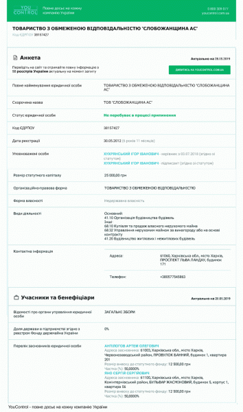 Самый частый основной вид деятельности его фирм – сдача в аренду недвижимости. Только где ж ее брать? Конечно, у строителей! Особенно у тех, с кем у Вадима Слюсарева тесные отношения. Например, с владельцем нескольких компаний он даже живет в одной квартире – судя по данным, полученным с помощью аналитической системы YouControl. В едином госреестре физическое лицо-предприниматель Вадим Алексеевич Слюсарев указал своим домашним адресом квартиру 201 в первом доме по переулку Банному в Харькове. В той же квартире, судя по регистрационным данным, проживает и соучредитель ООО «Слобожанщина АС». Зовут соучредителя Артем Анпилогов. И чтоб не соображать долго, кто у экс-генерала сожитель, скажу сразу – сын экс-зампрокурора области и экс-вице-губернатора Олега Аниплогова.