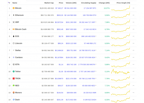 На данный момент средневзвешенный курс первой криптовалюты составляет $7 345, за последние сутки биткоин вырос более чем на 10%, а его капитализация составила $125,9 млрд.