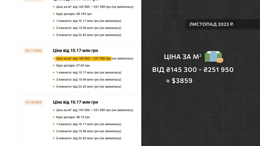 «Это невозможная цена. Ну, то есть если бы мы даже говорили не о конкретном ЖК, а просто об улице. Улица Мечникова – одна из самых дорогих улиц в Украине, потому что там очень классная инфраструктура. Там цена в старом фонде в 2023 году была 1500-2000 долларов за метр квадратный, если там какие-то суперплохие условия. В конкретном ЖК Signature на тот момент цена была 2500-3000 долларов», – объяснил hromadский риелтор Алексей Гнучих.