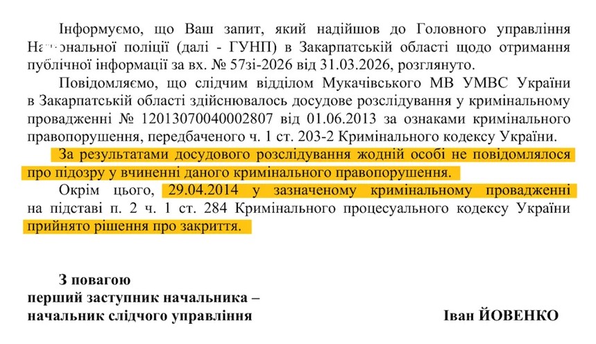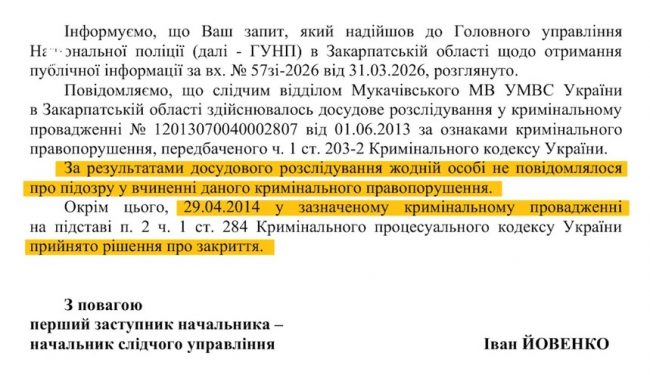 «По результатам досудебного расследования ни одному лицу не сообщалось о подозрении в совершении данного уголовного правонарушения» , — сообщили нам в полиции и добавили, что в апреле 2014 года дело закрыли.