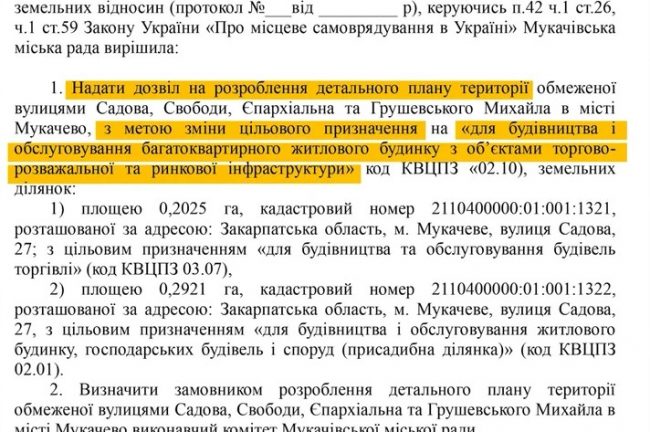Эти 50 соток земли вместе со зданием Анна Иваницкая приобрела в июне 2018 за 1 380 000 гривен. По тогдашнему курсу — чуть больше 50 тысяч долларов. Тогда эта земля предназначалась для строительства и обслуживания жилого дома, хозяйственных построек и сооружений. Но уже в декабре 2022 года решением сессии Мукачевского городского совета было разрешено разработать детальный план этой территории. Цель – дальнейшее изменение целевого назначения земли – на «для строительства и обслуживания многоквартирного жилого дома с объектами торгово-развлекательной и рыночной инфраструктуры».