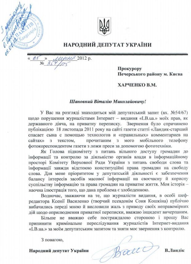 Народный депутат Украины Владимир Ландик обратился к прокурору Печерского района Киева Харченко В.М. с просьбой прекратить уголовное преследование журналистов интернет-издания LB.ua в результате его депутатского обращения от ноября 2011 года после публикации его частной переписки на сайте издания.