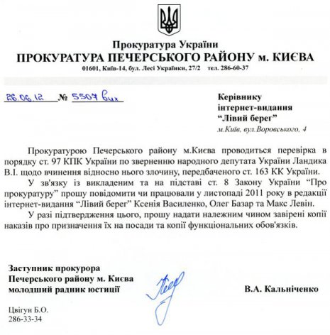 Народный депутат от Партии регионов Владимир Ландик обратился в прокуратуру Печерского района Киева с требованием возбудить уголовное дело в отношении журналистов "Левого берега". Об этом стало известно из запроса прокуратуры Печерского района, поступившего сегодня, 27 июня, в редакцию издания.
