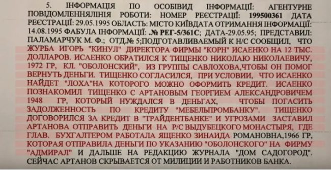 Кроме того, Тищенко фигурирует в делах о двух убийствах. Первое – убийство напарника «Коли Оболонского» по банде Савлохова Норика Амирханяна, которое произошло прямо на Крещатике. В базе идет речь, что после этого убийства Тищенко «перешел на нелегальное положение». Тогда даже проводились оперативно-розыскные мероприятия для установления местонахождения подозреваемого. Однако дело закрыли по амнистии.
