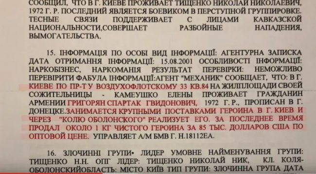 В другом документе говорится, что гражданин Армении Спартак Григорян занимается крупными поставками героина в Киеве и «через «Колю Оболонского» реализует его. За последнее время продал около 1 кг чистого героина за 85 тыс. долларов США по оптовой цене».
