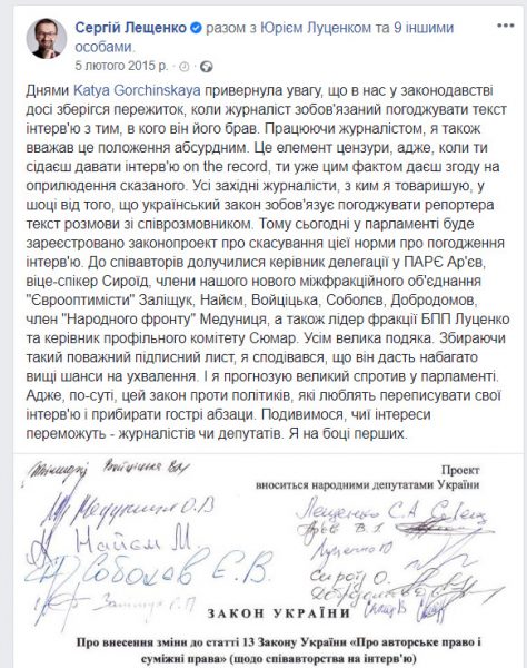 Любопытно, что будучи депутатом, именно Сергей Лещенко настаивал на отмене вообще законодательной нормы, которая указывает спикера соавтором интервью и требует согласования с ним текстов ответов. «Работая журналистом, я тоже считал это положение абсурдным. Это элемент цензуры, ведь когда ты садишься давать интервью on the record, ты уже этим фактом даешь согласие на обнародование сказанного. Все западные журналисты, с кем я дружу, в шоке от того, что украинский закон обязывает согласовывать репортера текст разговора с собеседником. Поэтому сегодня в парламенте будет зарегистрирован законопроект об отмене этой нормы о согласовании интервью. По сути, этот закон — против политиков, которые любят переписывать свои интервью и убирать острые абзацы. Посмотрим, чьи интересы победят — журналистов, депутатов. Я на стороне первых», — писал он на своей странице в социальной сети Facebook в 2015 году.