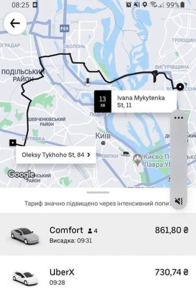 Данные сервисов для аренды такси Uklon, Bolt и Uber свидетельствуют, что цены заметно выросли из-за повышенного спроса. Например, поездка от метро Почайна до Майдана Независимости обойдется не менее чем в 200 грн, c Позняков до Контрактовой площади — дороже 400 грн, а от станции метро Васильковская до Золотых ворот — от 250 грн. При этом вызвать такси сейчас сложно, так как машин не хватает.