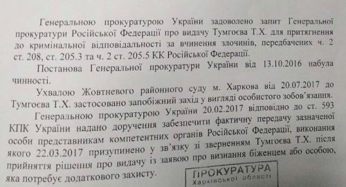 В это трудно поверить, но украинская генпрокуратура действительно выдала ФСБ РФ Тимура Тумгоева борца чеченского сопротивления, ингуша по происхождению, воевавшему за независимость Украины в составе добровольческого батальона им. Шейха Мансура. Вот соответствующий документ.