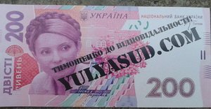 На купюрах помимо изображения бывшего премьер-министра Юлии Тимошенко стоит подпись: "Тимошенко - к ответственности!".