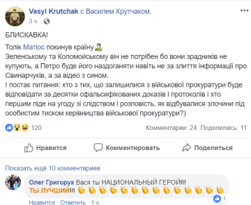 «Толик Матиос покинул страну. Зеленскому и Коломойскому он не нужен, потому что предателей не покупают, а Петр (Порошенко — ред.) его догонять даже не из-за слива информации о Свинарчуков, а через видео с сыном».