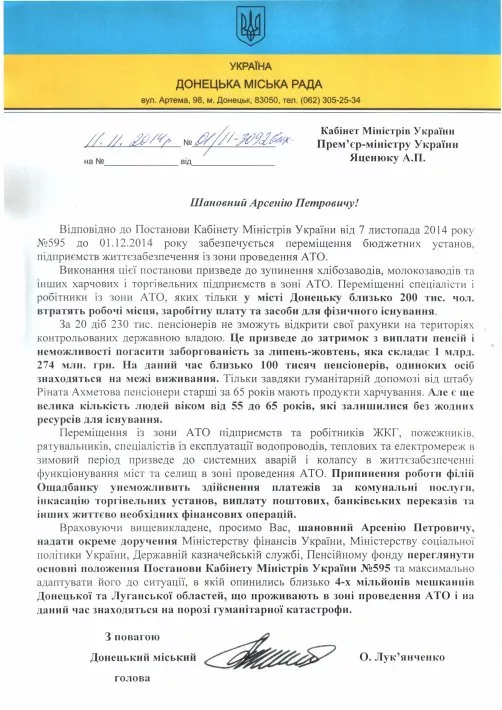 Пересмотреть вызвавшее широкий резонанс постановление Кабинета министров № 595, которое предусматривает перемещение из зоны АТО всех бюджетных организаций и предприятий жизнеобеспечения, просит премьер-министра Арсения Яценюка Донецкий городской голова Александр Лукьянченко. Соответствующая копия письма есть в распоряжении «ОстроВа».