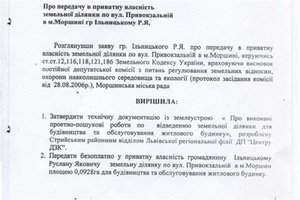 В распоряжение журналистов проекта «Хто тут живе?» попало решение горсовета от 31 августа 2006 года, которым мэру выделили в пользование земельный участок для индивидуального строительства. Интересно, что этот документ господин Ильницкий завизировал ... лично! Как утверждает мэр, участок для застройки он выбрал на прежнем стихийном свалке.