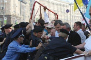 Сотрудники «Беркута» начали вульгарно выталкивать журналистов, не давая им снять приезд автозака с Тимошенко. При этом некоторых журналистов толкали руками, перетаскивали штативы от камер. Отдавал приказы человек в «гражданском». При этом делали это несмотря на всяческие протесты как журналистов, так и народных депутатов.