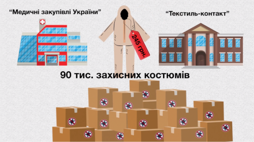 14 апреля Государственное предприятие «Медицинские закупки Украины» заключило договор с украинским производителем «Текстиль-контакт» на закупку 90 000 защитных костюмов стоимостью 245 гривен за каждый.