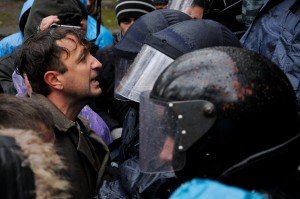 Возле окружной избирательной комиссии 223 в Киеве людей "спортивной внешности" и сторонников ВО "Свобода" разделили бойцы спецподразделения "Беркут".