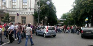 На улице Грушевского проходит акция протеста, владельцы валютных кредитов перекрыли дорогу. Обманутые люди ходят по пешеходному переходу туда-обратно, не давая тем самым проехать автомобилям, в том числе и общественному транспорту.