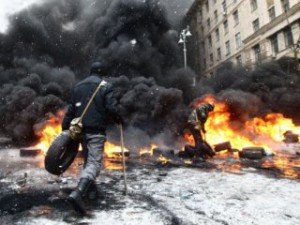 Митингующие, в свою очередь, расположили перед кордоном милиции горящие покрышки и закидывают милицию фейерверками.