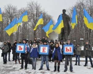Митинг проходил около памятника Шевченко. В их руках виднелись кубики с буквами «Ё», «Ы» и «Ъ». «Молодые регионы» сообщили журналистам, что таким образом они реагируют на законопроект свобовцев о функционировании украинского языка как государственного и порядка использования других языков. По их мнению, все, что сказано в представленном проекте это абсурд, например, «Свобода» предлагает запретить отправку писем и телеграмм, составленных из русского алфавита. Ну, разве не бред?!