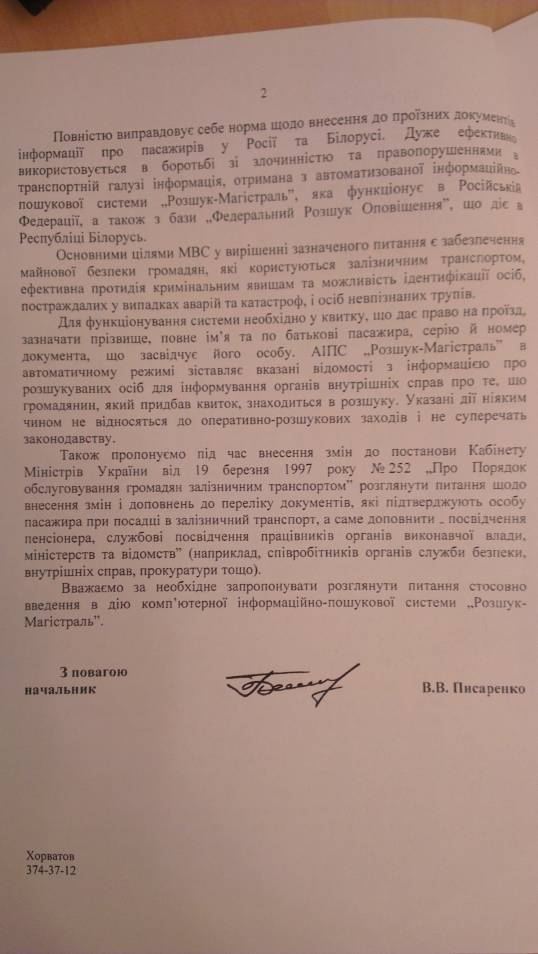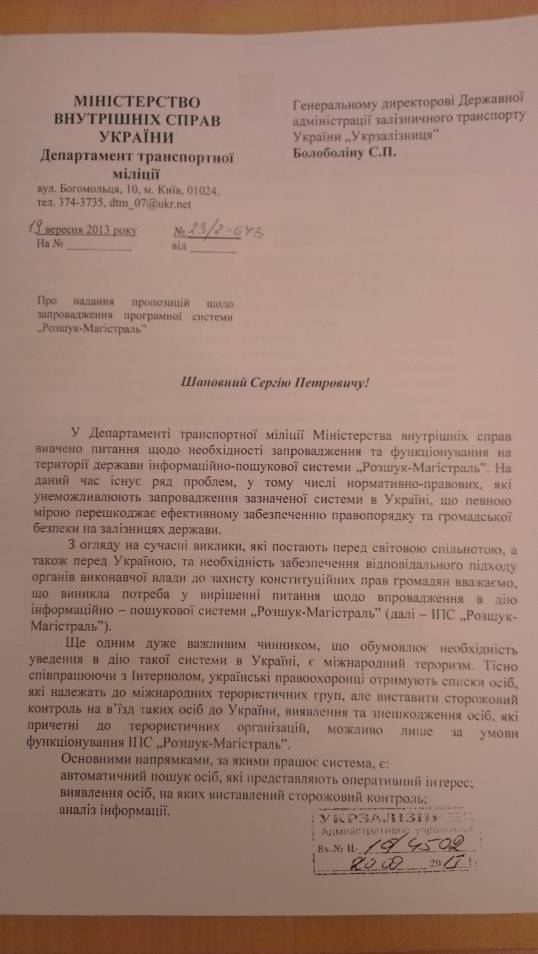 Министерство внутренних дел обратилось к "Укрзализныци" с предложением относительно железнодорожных билетов. Для того, чтобы защитить украинцев от террористических атак и преступных нападений в билеты предлагается вводить паспортные данные пассажиров. Это поможет создать поисковую систему с базой данных, благодаря которой ускорится поиск лиц, представляющий оперативный интерес.