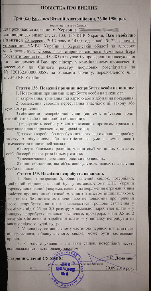 Вчера, 19 сентября 2013 года журналист издания "Дорожный контроль" из г. Херсона Виталий Косенко получил повестку в которой указано, что ему следует явится в понедельник 23 сентября 2013 года в УВД Херсонской области к следователю Демянюку И.К. В документе указано, что Виталию Косенко будет вручено подозрение в совершении уголовного преступления по ч.1 ст.343 Уголовного кодекса.