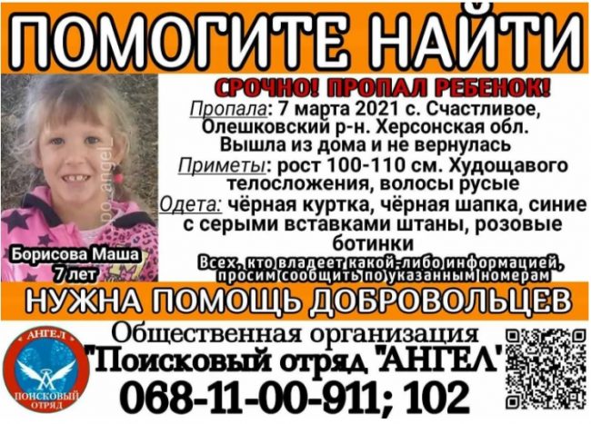 В Херсонской области третий день разыскивают пропавшую без вести 7-летнюю Марию Борисову.