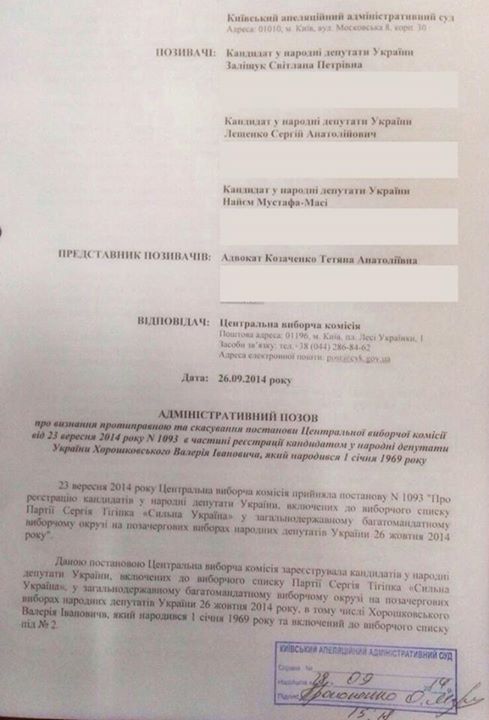 Кандидаты в народные депутаты Светлана Залищук, Мустафа Найем и Сергей Лещенко подали иск в суд на Валерия Хорошковского, который также баллотируется в ВР.