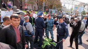 После этого люди сели и тротуар, держа в руках плакаты с надписями: "Мы не сопротивляемся!", "Украине - долю, политзаключенным - свободу!", А также плакаты с перечнем статей Конституции, которые предоставляют гражданам право на мирные собрания.