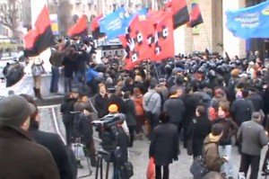 К 12:00 по Киеву несколько сотен представителей Украинской национальной ассамблеи — Украинской народной самообороны (УНА-УНСО) и других правых организаций собрались возле здания Главпочтампта. Там их в плотное кольцо сразу же взяли бойцы спецподразделения «Беркут» и оттеснили на Крещатик.