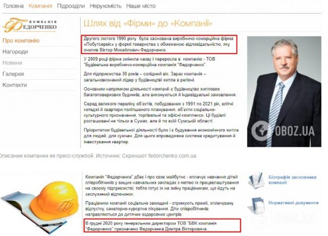 Сайт «БВК компания Федорченко» подтверждает это. В декабре 2020-го Дмитрий Федорченко (сын основателя) получил кресло генерального директора. Тогда же (3 декабря 2020 года) Федорченко-старший стал председателем Сумского облсовета.