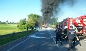 Выяснилось, что во время движения у грузовика лопнуло колесо, в результате чего появились искры, которые и стали причиной возгорания. Когда на место ЧП приехали пожарные, "Рено-Премиум" был полностью в огне. Понадобился час для ликвидации пожара.