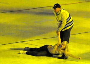 Український феміністський рух FEMEN намагалися провести топлес-акцію під час відкриття НСК "Олімпійський" в Києві. На поле прорвалися три роздягнені до пояса дівчата.