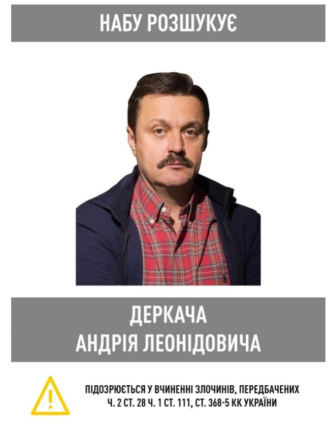 Нардеп Андрей Деркач объявлен в розыск. Об этом сообщают пресс-службы Национального антикоррупционного бюро и Специализированной антикоррупционной прокуратуры.