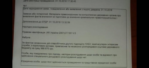 В отношении сотрудников Второго подразделения детективов НАБУ пока открыто уголовное производство «по факту незаконных действий сотрудника вопреки интересам службы, из корыстных побуждений, присвоил и незаконно распорядился средствами государственного бюджета на сумму 988 675 грн».