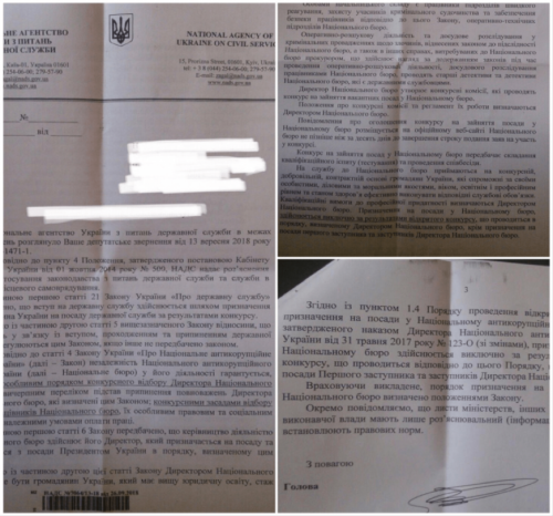 Однако, в распоряжении общественных активистов оказалось письмо Национального агентства Украины по вопросам государственной службы, разъясняет порядок приема на работу сотрудников НАБУ. В соответствии со статьей 4 Закона Украины «О Национальном антикоррупционном бюро Украины» независимость НАБУ в его деятельности гарантируется, в частности, особым порядком конкурсного отбора — как директора НАБУ, так и других работников НАБУ.