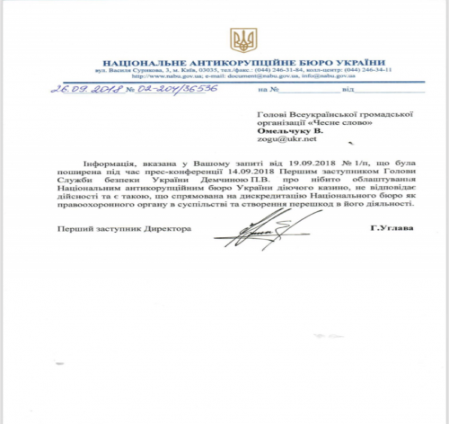 Когда Всеукраинская общественная организация «Честное Слово» обратилась к директору НАБУ с просьбой опровергнуть или подтвердить факт создания сотрудниками НАБУ незаконного игорного заведения, в ответ они получили ответ, что это «попытка дискредитации НАБУ».