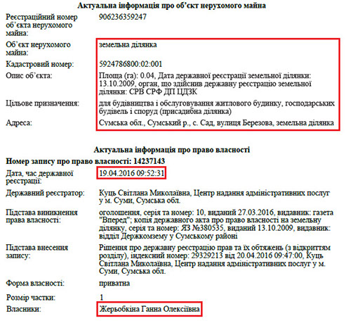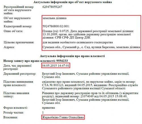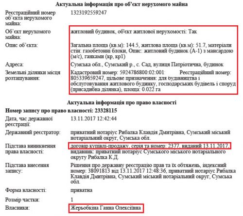 Проживает прокурор вместе с женой в доме площадью 377 кв. м. Расположен он в поселке Сад, недалеко Сум. Владельцем этого жилья значится мать прокурора Анна Алексеевна Жерьобкина, а задекларированная его стоимость — 1900000 грн.