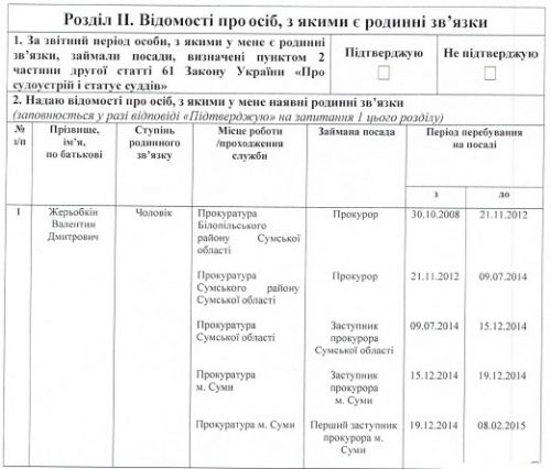 Похожая ситуация была с квартирой самого прокурора. Валентин Дмитриевич Жерьобкин в своей декларации 2015 года указывал, что пользуется квартирой отца в Сумах с 2005 года. Однако в декларациях за 2012 и 2013 годы это жилье не упомянутое. Зато в декларации за 2014 — вказане.За какой логике это было сделано — неизвестно.