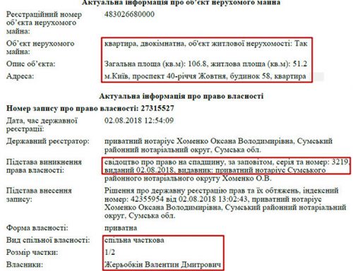 Однако около месяца назад, после смерти отца, вышеупомянутое авто Mersedes-benz ML350 2013 выпуска Валентин Жерьобкин скорее всего получил в наследство, ведь именно он значится сегодня его владельцем. Это же касается и квартиры в Киеве площадью 106 кв. м., по адресу: проспект 40-летия Октября (сейчас проспект Голосеевский), 58. Это многоквартирный дом, в котором подобное жилье стоит минимум 5 млн грн. Этого движимого и недвижимого имущества еще нет в электронных декларациях прокурора.