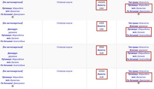 Получая подарки в 2500000 грн от отца, Валентин Жерьобкин, очевидно, может позволить себе много экономить. В частности, в его собственности 450 тыс. Грн и 52 тыс. Евро наличными. У жены Евгении Анатольевны — 6,5 тыс. Долларов и 5 тыс. Евро.