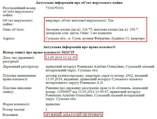 В его собственности с 2014 года является квартира в Сумах, по адресу: улица Фабричная, 11. Этот дом тоже есть новостройкой. Площадь квартиры Анатолия Петровича — 126 кв. м.