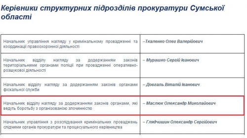 В прокуратуре до сих пор работают лица, которые были причастны к преследованию активистов евромайдана и игнорировали наказание правохранителей в те времена. Один из них — нынешний начальник отдела надзора за соблюдением законов органами, ведущими борьбу с организованной преступностью, управления надзора в уголовном производстве и координации правоохранительной деятельности прокуратуры Сумской области — Александр Николаевич Маслюк.