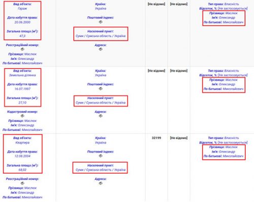 Среди прочего недвижимого имущества в собственности прокурора есть две квартиры, гараж и земельный участок в Сумах. Интересно, что одной из квартир он владеет вместе со своей дочерью Анной Александровной Маслюк, которая работает прокурором Сумской местной прокуратуры. В собственности нынешней жены прокурора лишь один земельный участок в Сумах. Его площадь 1000 кв.м.