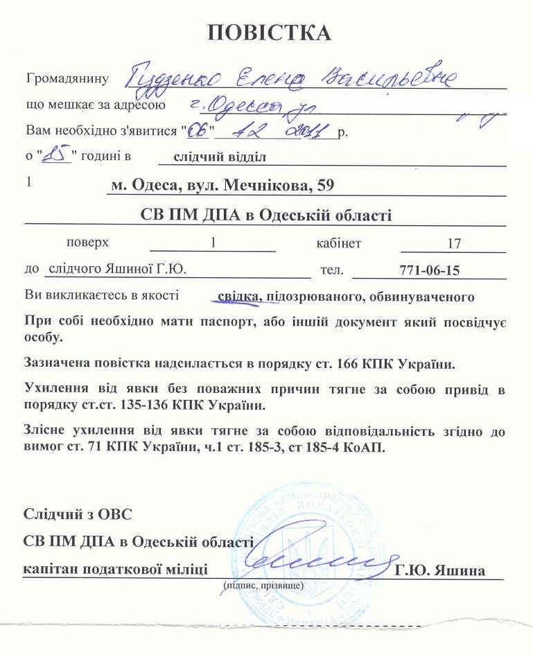 Презентация Заключения об общественной экспертизе ГНА в Одесской области должна была состояться 6 декабря в 16.00. Однако следователь по особо важным делам налоговой милиции Анна Яшина внезапно решила вызвать на допрос директора Центра Елену Гудзенко, и именно на 15:00.