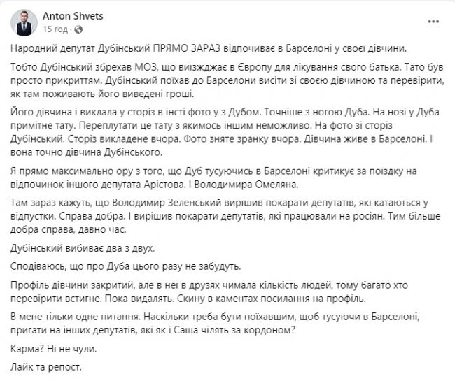 «Я прямо максимально пищу из того, что Дуб тусуясь в Барселоне критикует за поездку на отдых другого депутата Аристова. И Владимира Омеляна. Там сейчас говорят, что Владимир Зеленский решил наказать депутатов, катающихся в отпуске. Дело хорошо. И решил наказать депутатов, работавших на россиян. Тем более хорошее дело, давно пора. Дубинский выбивает два из двух. Надеюсь, что о Дубе в этот раз не забудут. Профиль девушки закрыт, но у нее в друзьях немало людей, поэтому многие проверить успеют. Пока удалят. У меня только один вопрос. Насколько нужно быть уехавшим, чтобы тусуя в Барселоне, прыгать на других депутатов, которые как и Саша едут за границу?», — добавляет Швец.