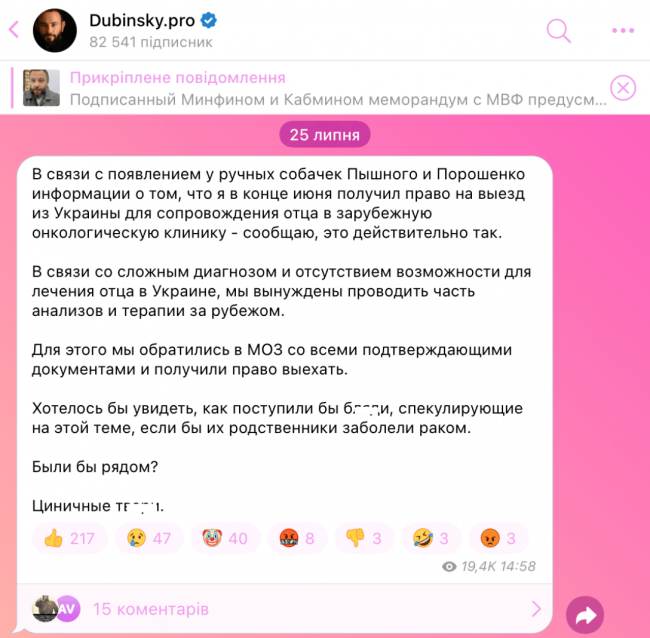 Дубинский отреагировал на обвинения в соцсетях. Он подтвердил, что получил право на выезд из Украины для сопровождения отца в иностранную онкологическую клинику.