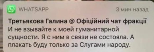 «И не взывайте к моей гуманитарной сущности. Я с ним в связи не состояла. А плакать буду только за «слугами народа», – отмечала «слуга».