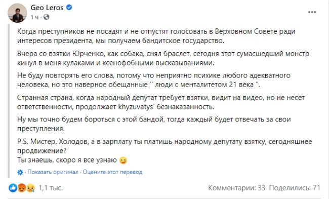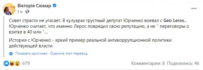 «В Раде страсти не угасают. В кулуарах печально известный депутат Юрченко подрался с Geo Leros (Гео Леросом. — Ред)… Юрченко считает, что именно Лерос навредил его репутации, а не «переговоры о взятке в 40 млн» … История с Юрченко — это яркий пример реальной «антикоррупционной политики» действующей власти», — заявила Сюмар.